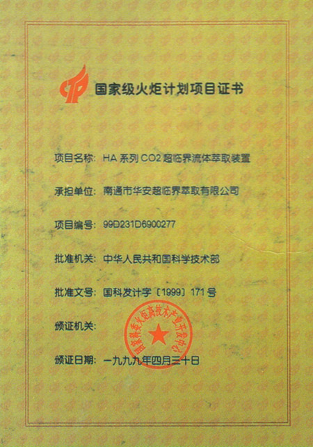 火炬計(jì)劃項(xiàng)目證書
